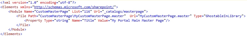 • Open “Element.xml” file of “CustomMasterPage” module.