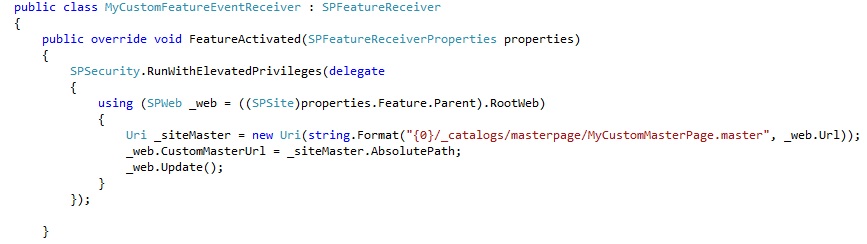 SharePoint 2010 – How to set default/custom master Page programatically using VS Studio