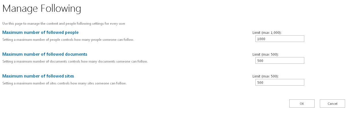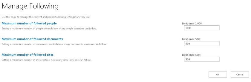 - In the Maximum number of followed people box, type the maximum number of people that a user can follow from the user’s My Site.