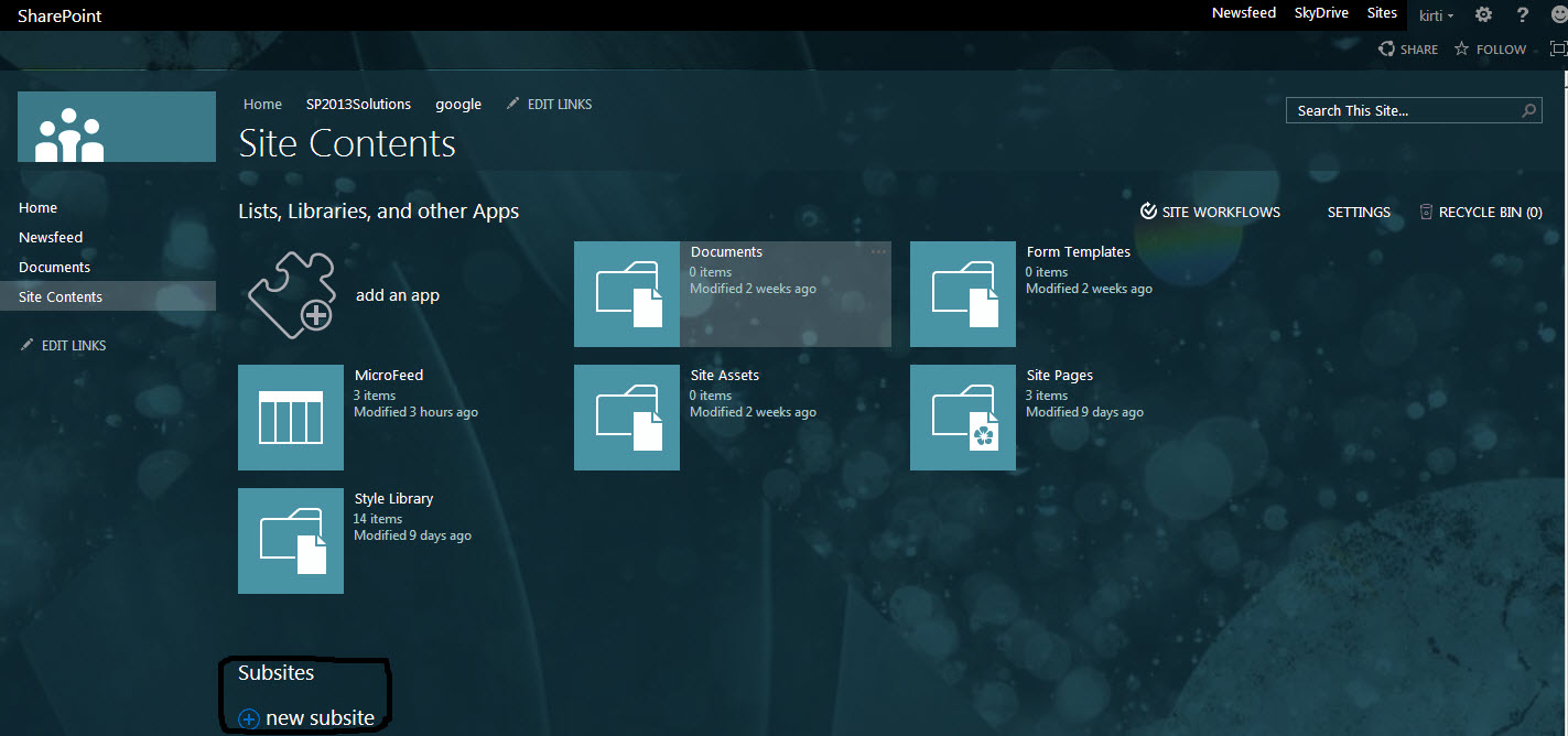In the site Content of a site click on “new subsite” (See below screen – at bottom ‘new subsite’ is selected). We are trying to create a discussion board here.