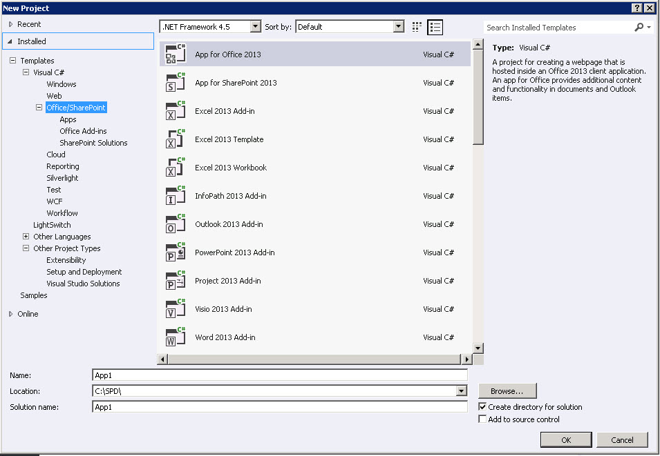 I have installated tools/extensions required for Office/SharePoint development. Click on New Project and this time check that SharePoint is now renamed to Office/SharePoint.