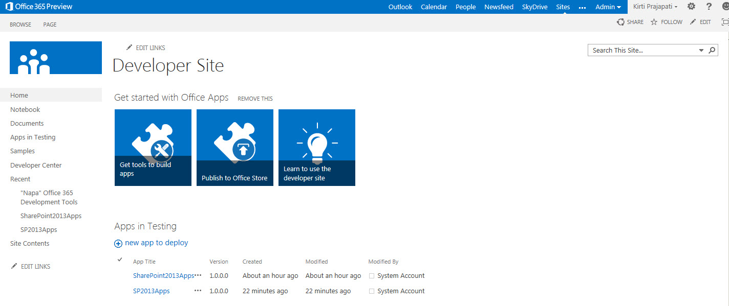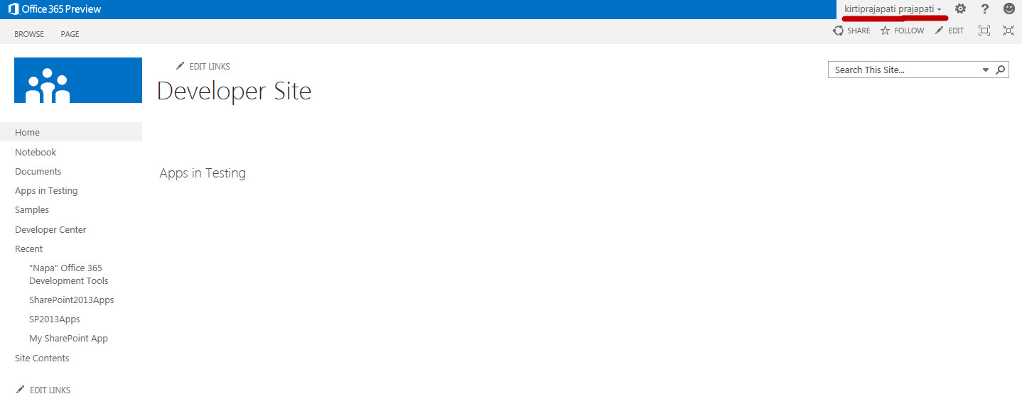 I am assuming, you have setup your Office 365 Developer Site. Once you done with that, your screen would look like as below screen: