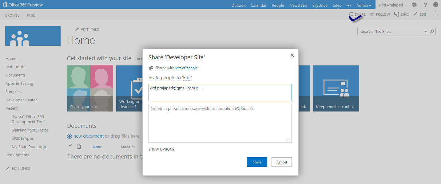 (1) Give people access to the site by clicking on “SHARE” link and enter email address (Note: you can set permission level as well)