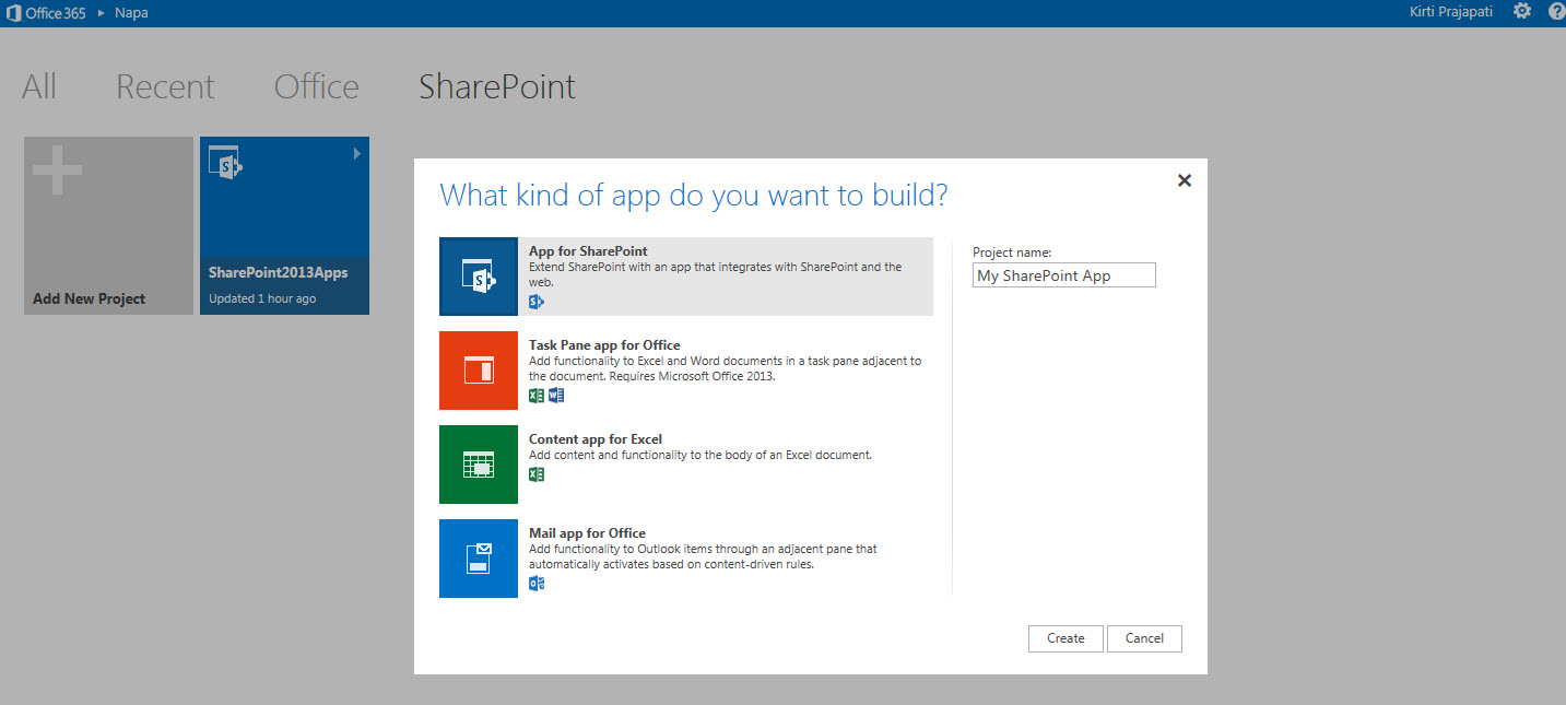 How to Create an app for SharePoint Project: Click on “Add New Project” and Choose the App for SharePoint tile, name the project “My SharePoint App” for SharePoint, and then choose the Create button.