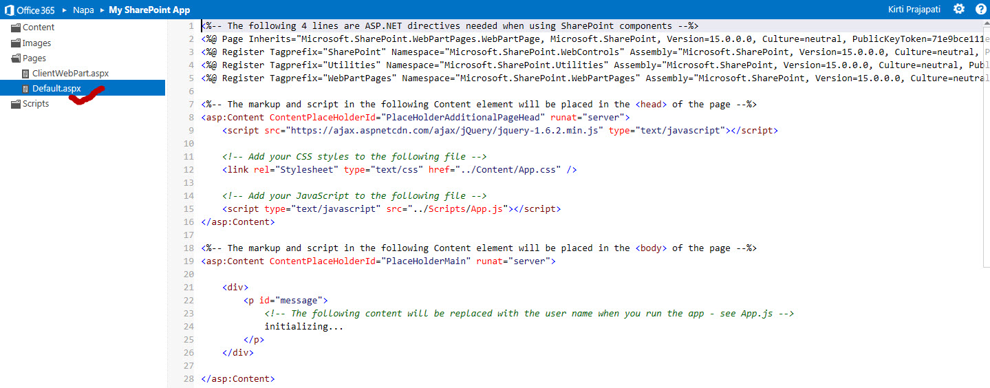 Once the project is created, you can see on the left side of the page under the Pages folder, choose the Default.aspx page if it isn’t already selected.
