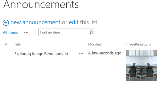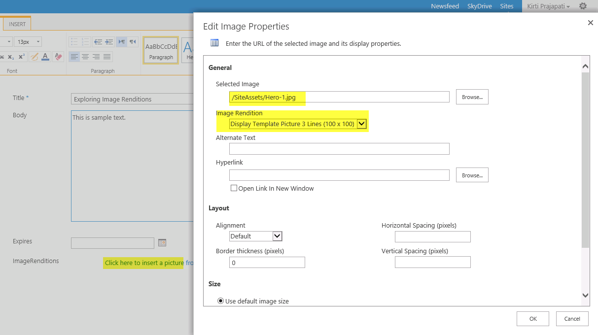 Step 6: Create new list item to view ImageRenditions Image Site Column. Select any “Template” from Image Renditions drop down after selecting specific image from Site Assets (Or from other resource) and click on OK.