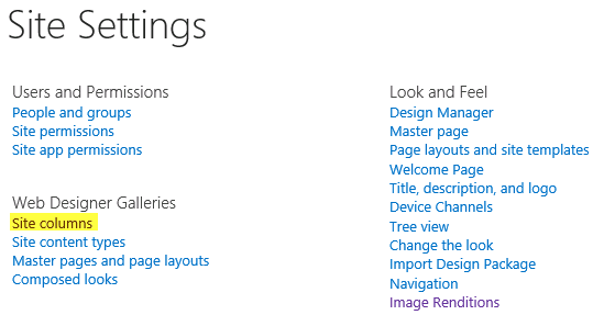 Step 1: Navigate to Site Columns in Site Settings under Web Designer Galleries