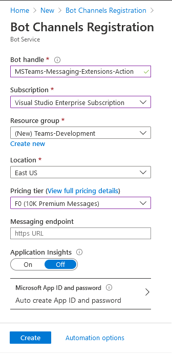 6. Fill in the details to create Bot channels registration.