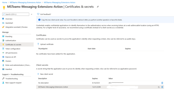 4. Under Certificates & secrets , create New client secret.