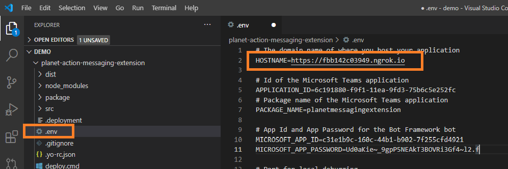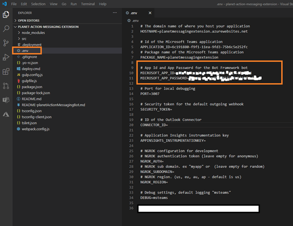 4. In the .env file, configure application ID and client secret from Bot channels registration.