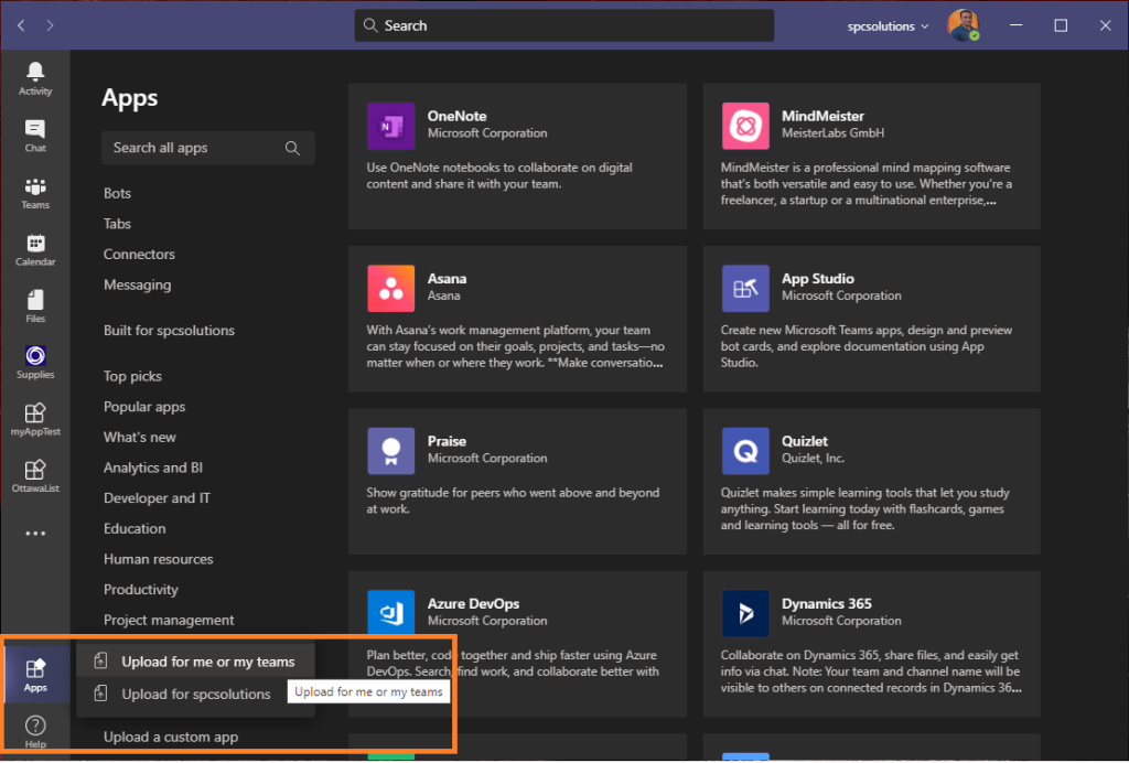 7. Open MS Teams and from Apps, upload your .zip package file by clicking on Upload a custom app.