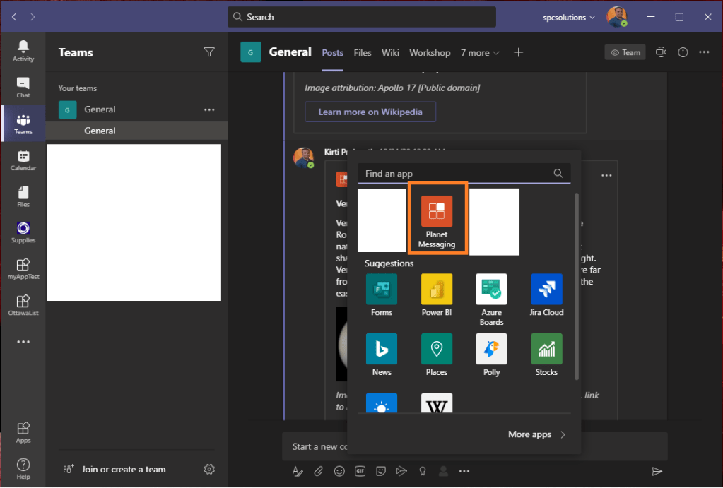 8. After adding, from compose box of MS Teams you can access this Action-based messaging extensions. Using this users can trigger actions in external services while inside of Teams.