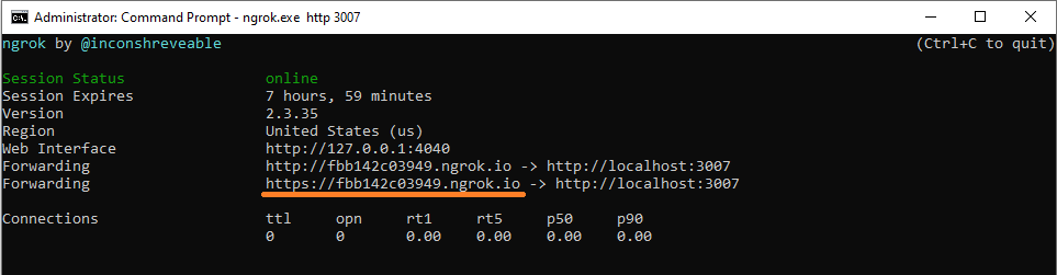- Open a separate command prompt and run ngrok.exe command as below.